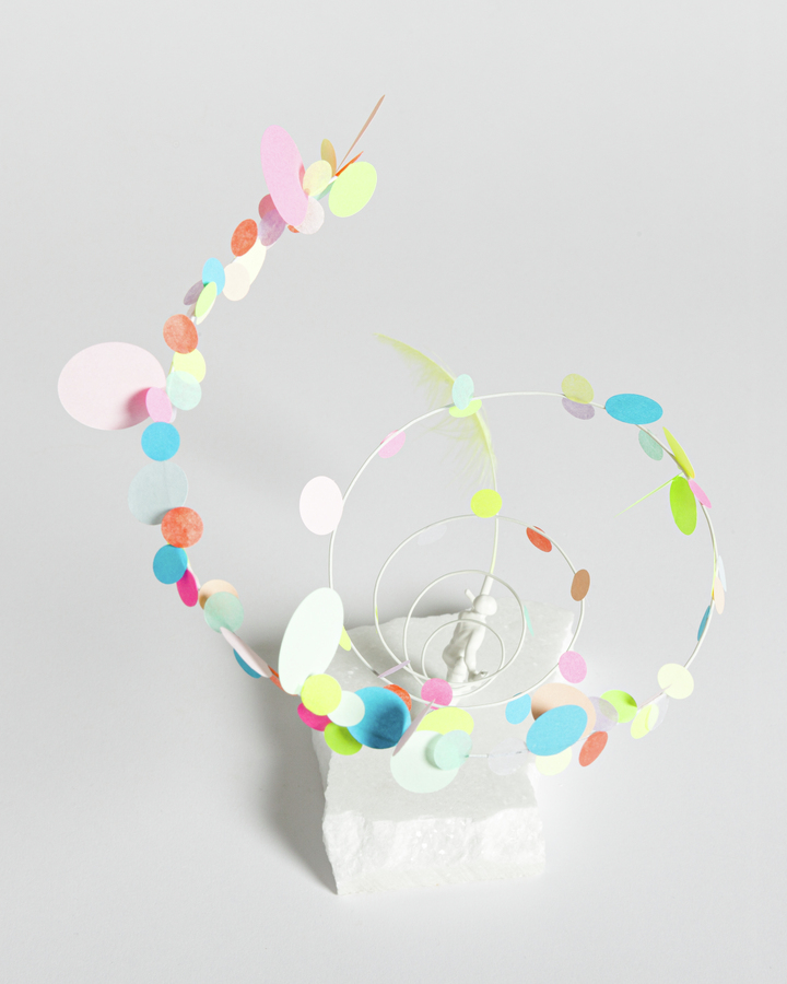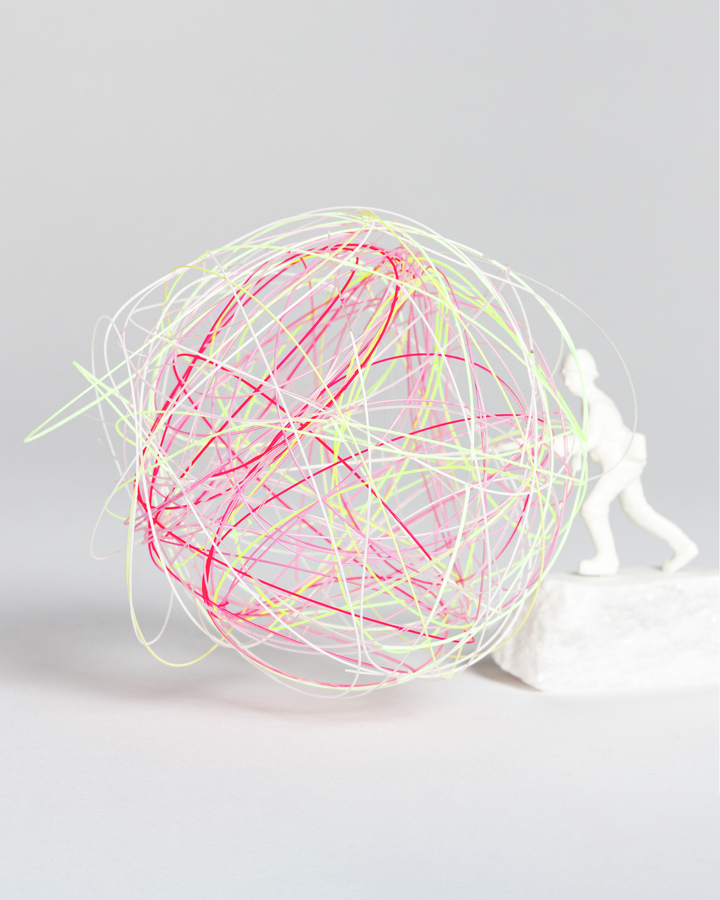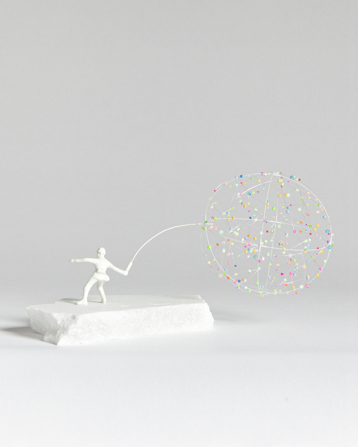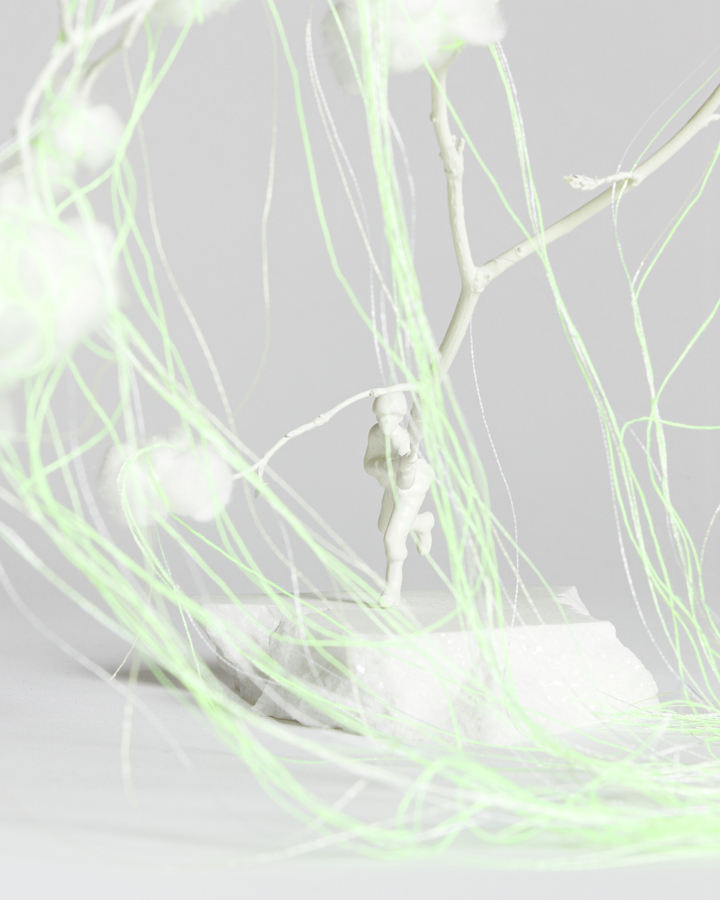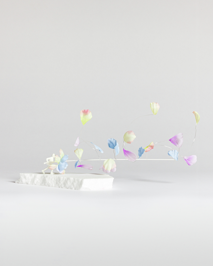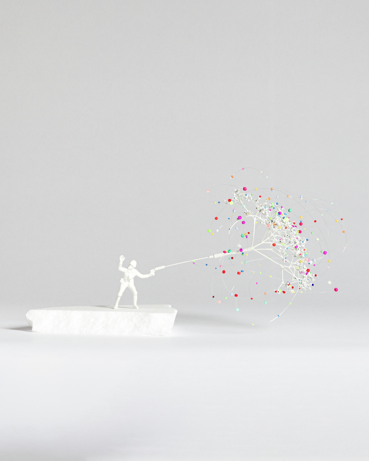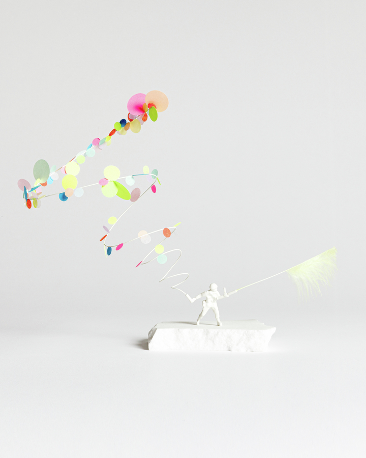 Fifteen years ago, I worked at a daycare center for children. One day, I accidentally carried a small toy soldier home in my pocket. This little soldier found his way into my collection of finds, and, as with many of my finds, he started to take on a life of his own. I added a small twig of mimosa to my soldier’s rifle, which seemed to almost explode out of it.